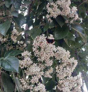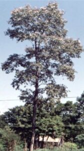 - Flores: Inflorescencias en panojas, con flores perfectas, de 1,5 cm de largo, corola blanca con 5 lóbulos. Es un árbol melífero que florece durante el verano extendiéndose hasta el otoño, sus flores se dan en racimos de pequeñas flores blancas, sin olor, de comportamiento caducifolio.