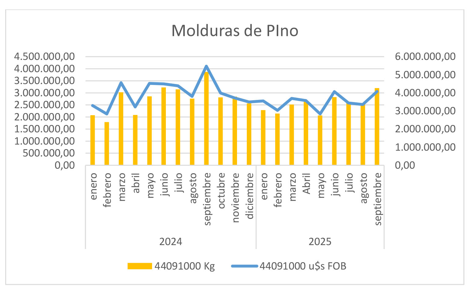 En el segmento de molduras, orientado principalmente a Estados Unidos, las ventas se mantienen estables. La retracción del tercer trimestre responde al comportamiento estacional del mercado norteamericano, donde las compras se reducen hacia fin de año por razones fiscales. Se espera **una reactivación en el primer trimestre de 2026.