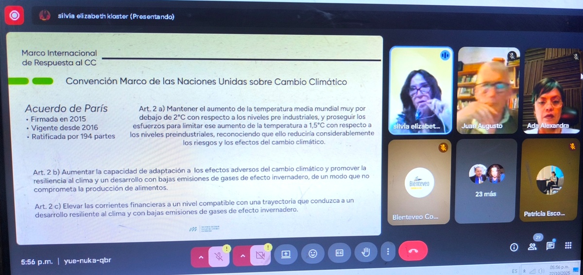 La subsecretaria de Gestión, Desarrollo Sostenible e Innovación en el Ministerio de Cambio Climático de Misiones, Silvia Kloster, se refirió al Plan de Respuesta de Adaptación y Mitigación que se lleva adelante en la provincial un seminario virtual para periodistas. Además, destacó el trabajo logrado en la obtención de datos como la huella de carbono, los avances para certificar créditos de carbono y adelantó la participación de Argentina y Misiones en la COP30 a realizarse en Belém de Pará, Brasil, del 10 al 21 de noviembre.
