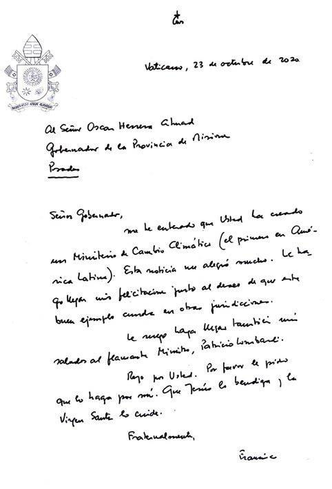 A su vez, en la misiva invitaba a ser voceros de la justicia ambiental y la protección de la selva. Esta misiva es parte de su llamado global a la acción climática, evidenciado en la encíclica Laudato Si’ (2015) y el documento Laudate Deum (2023), que promueven el cuidado del medio ambiente como imperativo moral y la necesidad de políticas para la reducción de emisiones y energías limpias.