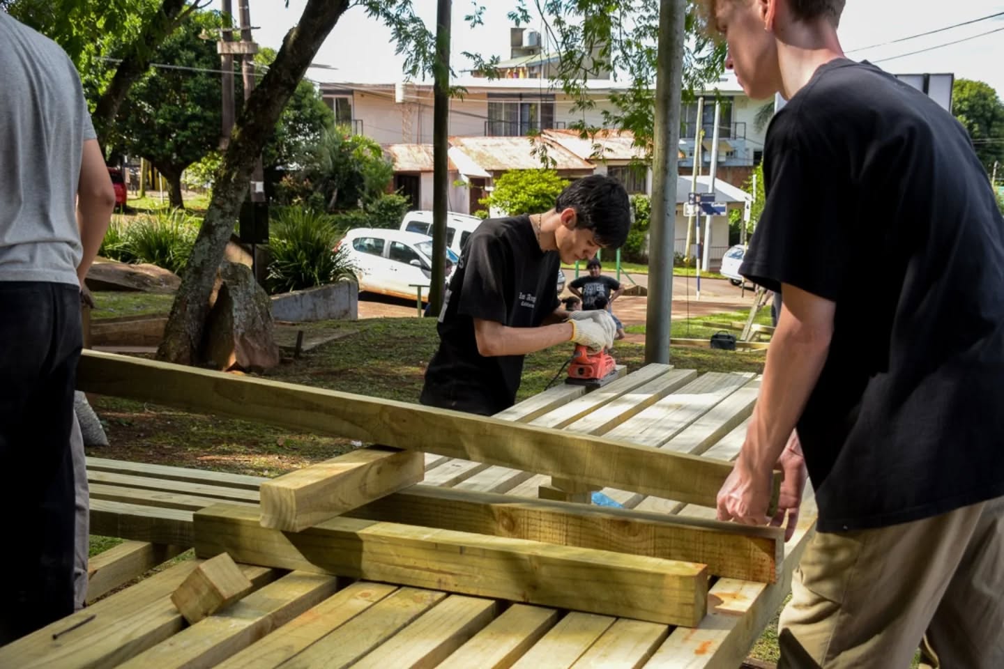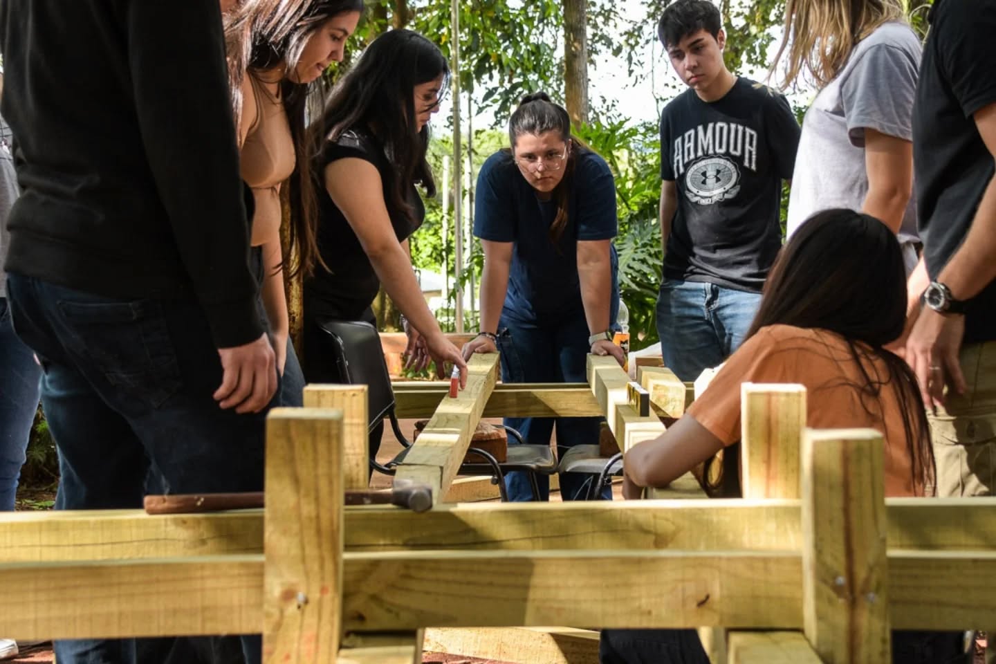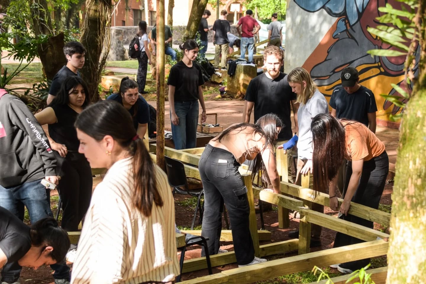 Durante toda la jornada, el campus de la FAyD se convirtió en un espacio de trabajo colaborativo donde los grupos exploraron las posibilidades constructivas de la madera local, poniendo en práctica los aprendizajes surgidos en los conversatorios y talleres.