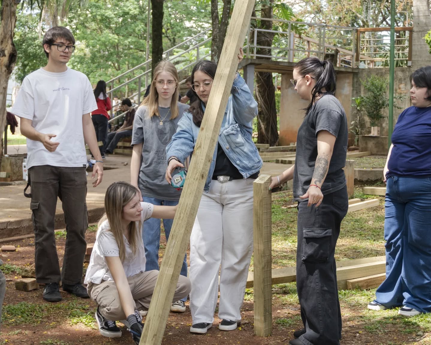 La segunda jornada, desarrollada el viernes, estuvo dedicada a la fase de construcción, en la que los equipos de estudiantes y docentes dieron forma a los dispositivos arquitectónicos proyectados el día anterior.