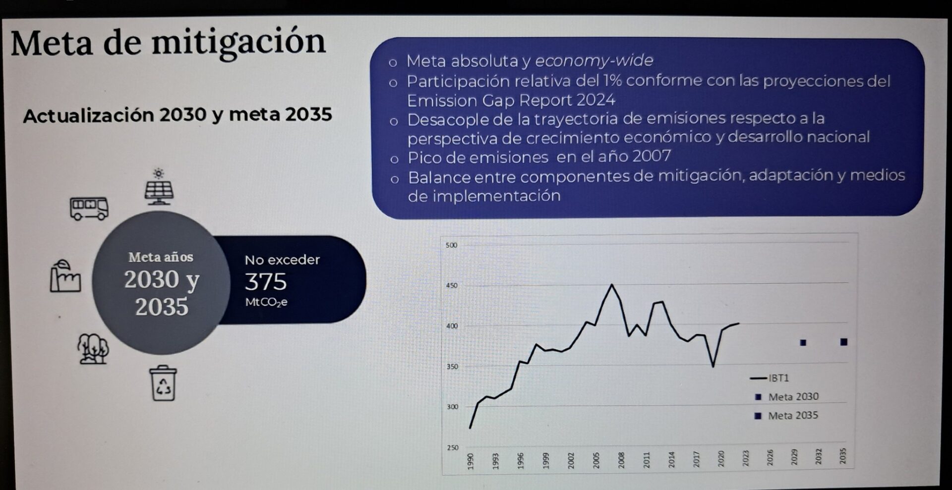 La nueva NDC fija como objetivo no superar las 375 millones de toneladas de CO2 equivalente (MtCO2e) para 2030 y 2035. Si bien esta meta es menos ambiciosa que la anterior (349 MtCO2e), desde la Subsecretaría se la considera más transparente y completa, ya que incluiría emisiones previamente no contabilizadas en versiones anteriores del plan nacional.