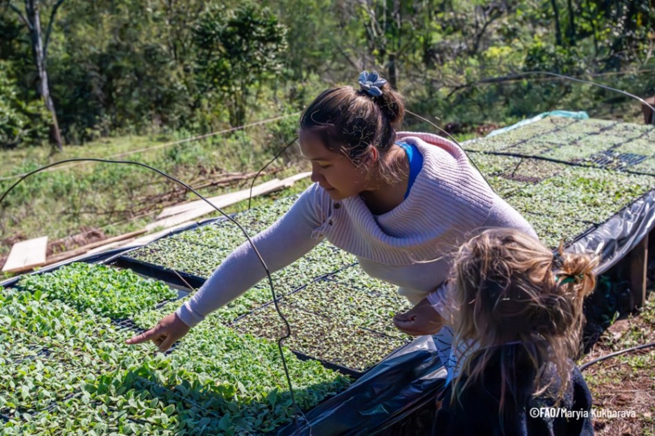 Las plántulas de los árboles son un elemento central del enfoque de las mujeres. Con el apoyo de la FAO y de la Asociación Civil Minka, están aprendiendo a cultivar especies nativas; algunas se destinan a la madera, otras se eligen por ofrecer alimentos, medicinas o hábitats para los polinizadores.