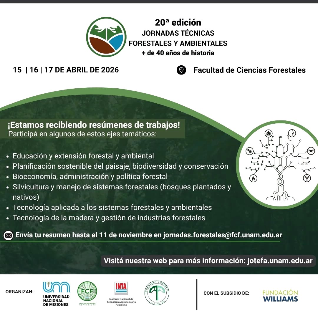 MISIONES (noviembre de 2025).— Los días 15, 16 y 17 de abril de 2026, la Facultad de Ciencias Forestales de Eldorado (FCF–UNaM) organizará, junto a la Estación Experimental Agropecuaria INTA Montecarlo y el Colegio de Ingenieros Forestales de Misiones (COIFORM), la 20ª edición de las Jornadas Técnicas Forestales y Ambientales (JOTEFA), un encuentro bienal que cumple cuatro décadas de trayectoria ininterrumpida.