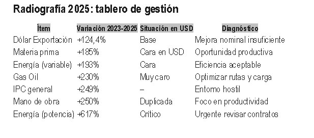 El sector quedó atrapado en una trampa de costos. La Argentina de fines de 2025 es cara en dólares, similar a Uruguay o partes de Europa, pero con infraestructuras y productividad aún en desarrollo.
