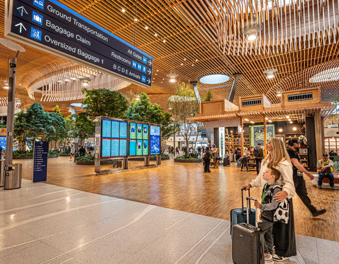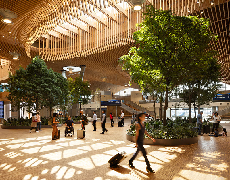 ·  Portland International Airport (Estados Unidos): uno de los proyectos de mass timber más grandes del país. Su nuevo techo ondulado en madera crea una sensación de “bosque interior”, con árboles vivos y jardines dentro del terminal.