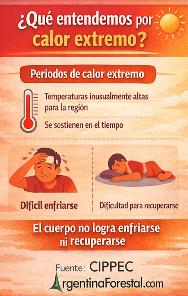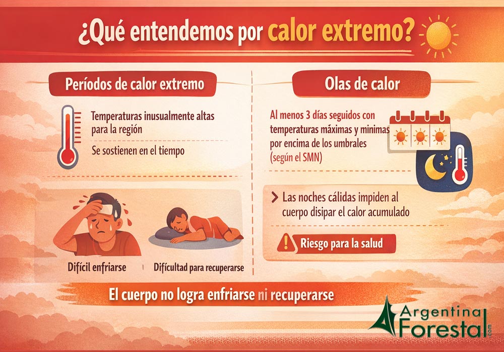 Desde un punto de vista técnico, el SMN define al calor extremo como un período de al menos tres días consecutivos en el que las temperaturas máximas y mínimas igualan o superan los valores umbral establecidos para cada localidad. La temperatura nocturna cumple un rol central: cuando también se mantiene elevada, el cuerpo no logra disipar el calor acumulado y el riesgo para la salud aumenta.
