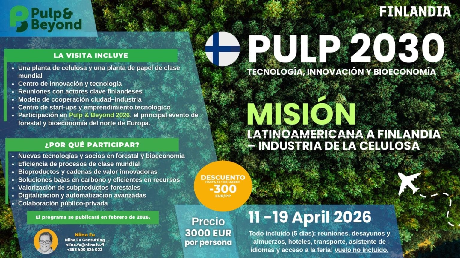 Del 12 al 18 de abril de 2026, Finlandia volverá a posicionarse como el epicentro global de la industria forestal con la realización de Pulp & Beyond 2026, el encuentro más influyente del norte de Europa para el sector. Se organizan dos delegaciones latinoamericanas coordinadas por la consultora internacional Niina Fu, con un programa estratégico para acceder a conferencias, visitas técnicas, generar contactos de negocios y acceder al conocimiento directo de las nuevas innovaciones en la industria.
