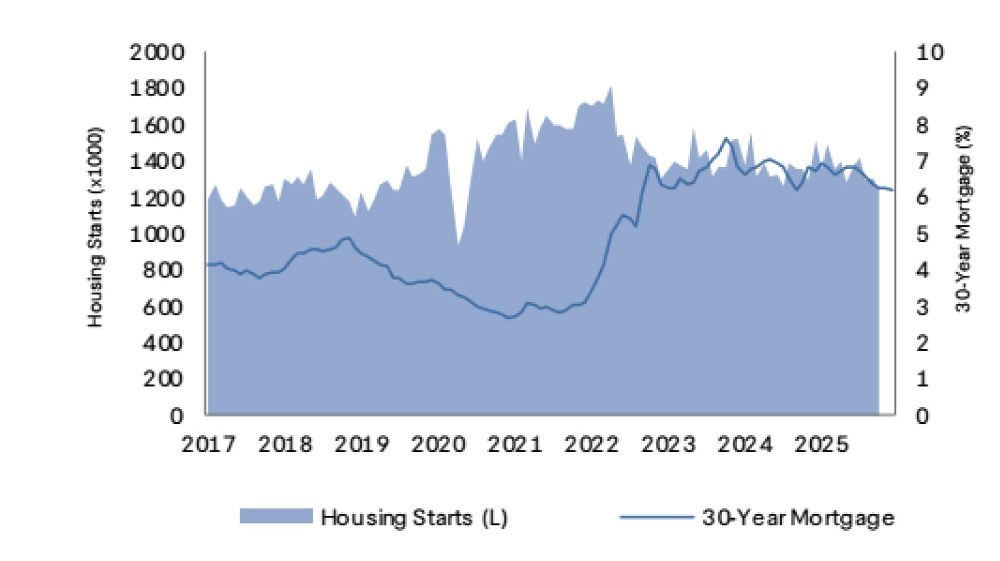 En Estados Unidos, la construcción de viviendas se mantuvo estable, aunque en niveles reducidos durante el cuarto trimestre de 2025, afectada por tasas de interés hipotecarias elevadas.
