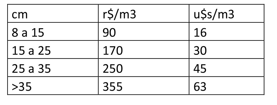 En Chile el precio promedio de rollos en pie para aserradero ronda los u$s 52/m3.