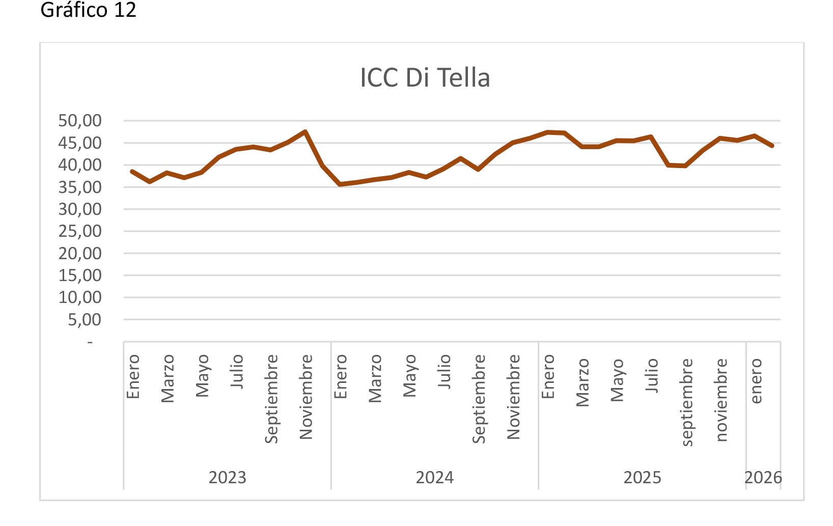 Por su parte, el Índice de Confianza del Consumidor de la Universidad Torcuato Di Tella se ubicó en 44,38 puntos en febrero, con retrocesos tanto mensuales como interanuales, señalando cautela en el consumo.