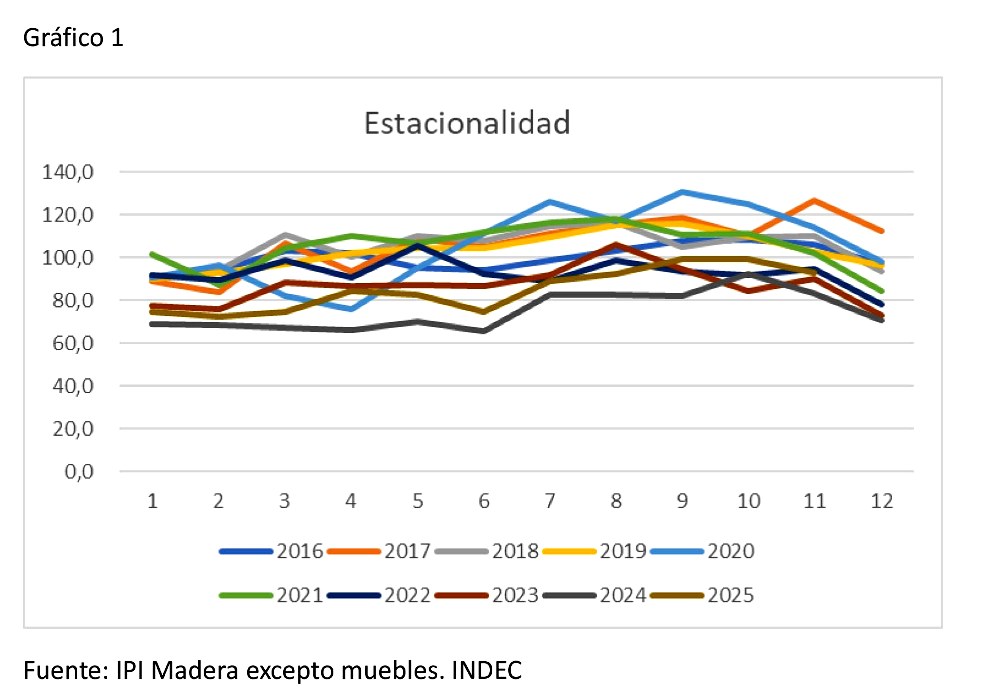 A los fines de mejorar la información de mercado se analizó la estacionalidad de la producción, y se utilizó el Índice de Producción Industrial sector Madera entre los años 2016 y 2025. En el Gráfico 1 se observa la estacionalidad mensual de la demanda de madera, se