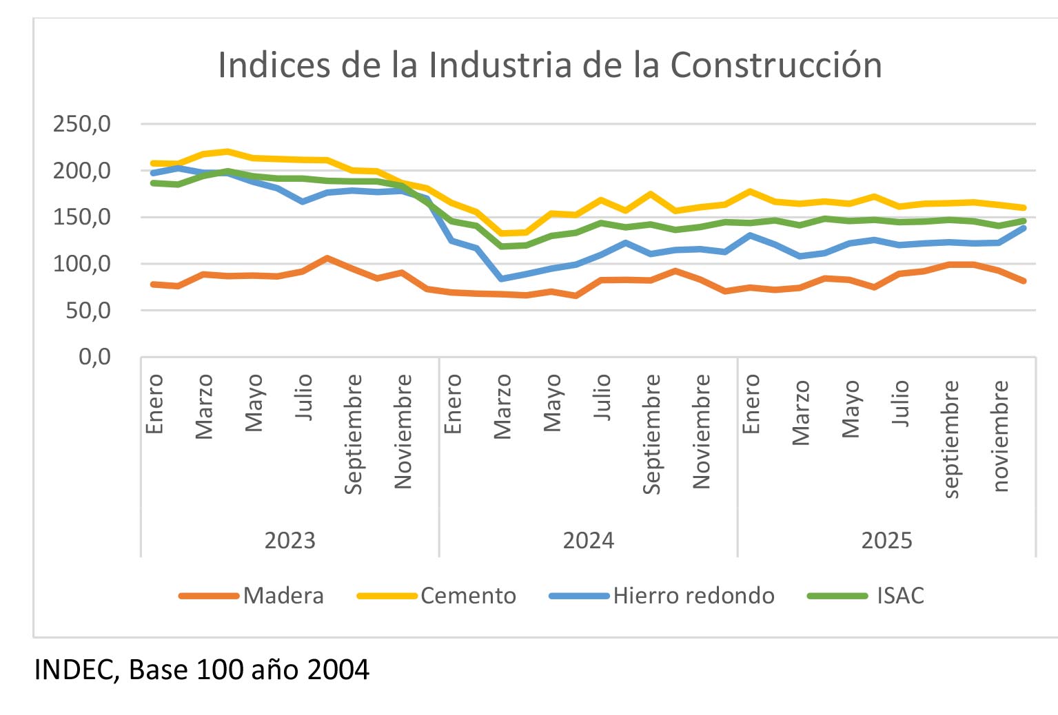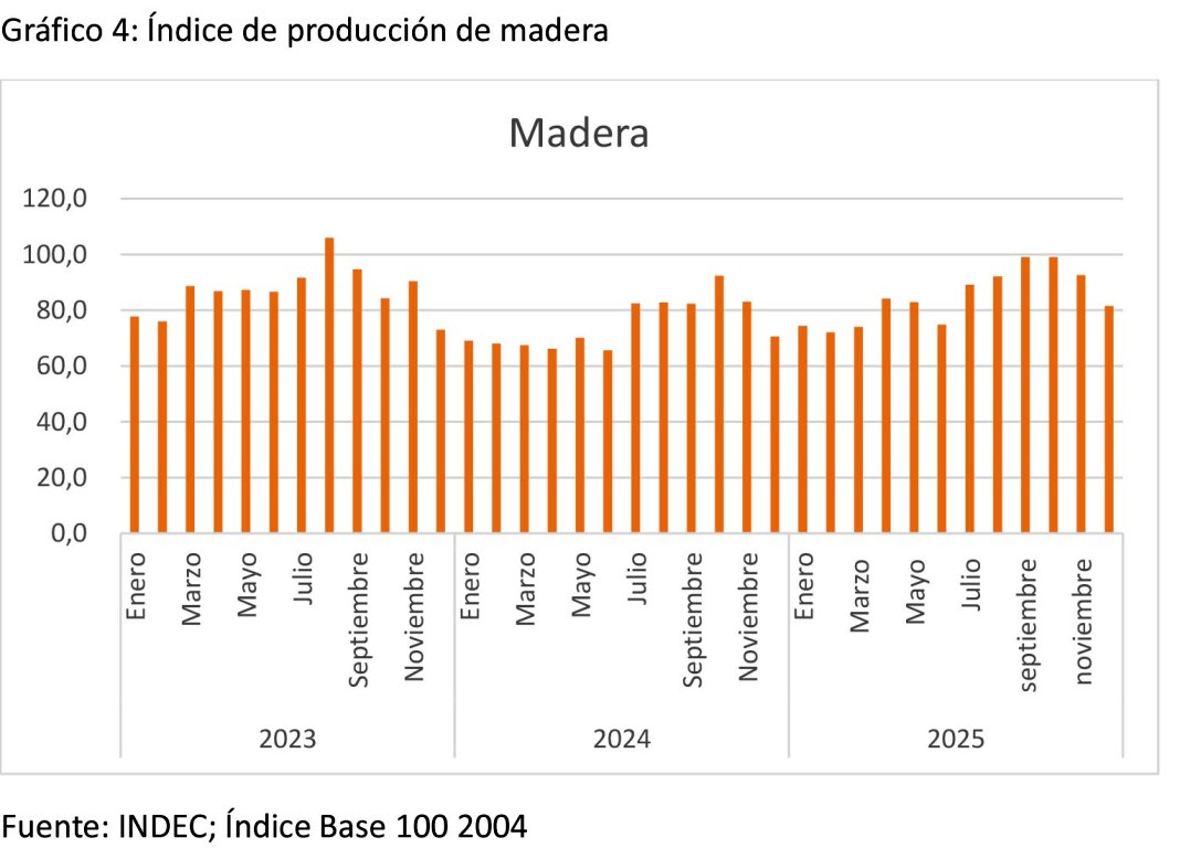 «Las fuentes consultadas informan que en la primera mitad del año 2024 se manifestó un sostén inercial de la actividad proveniente de la inyección de pesos en el mercado durante el segundo semestre de 2023.En la segunda mitad de 2024 se ralentiza el efecto y se entra en una estabilización con tendencia negativa. Le siguió el estancamiento durante 2025, El IPI Nacional y la actividad maderera local han seguido la misma tendencia. El aumento del precio de los rollos no aumenta la actividad del aserradero, sino que le presiona el margen industrial», detalla el informe.
