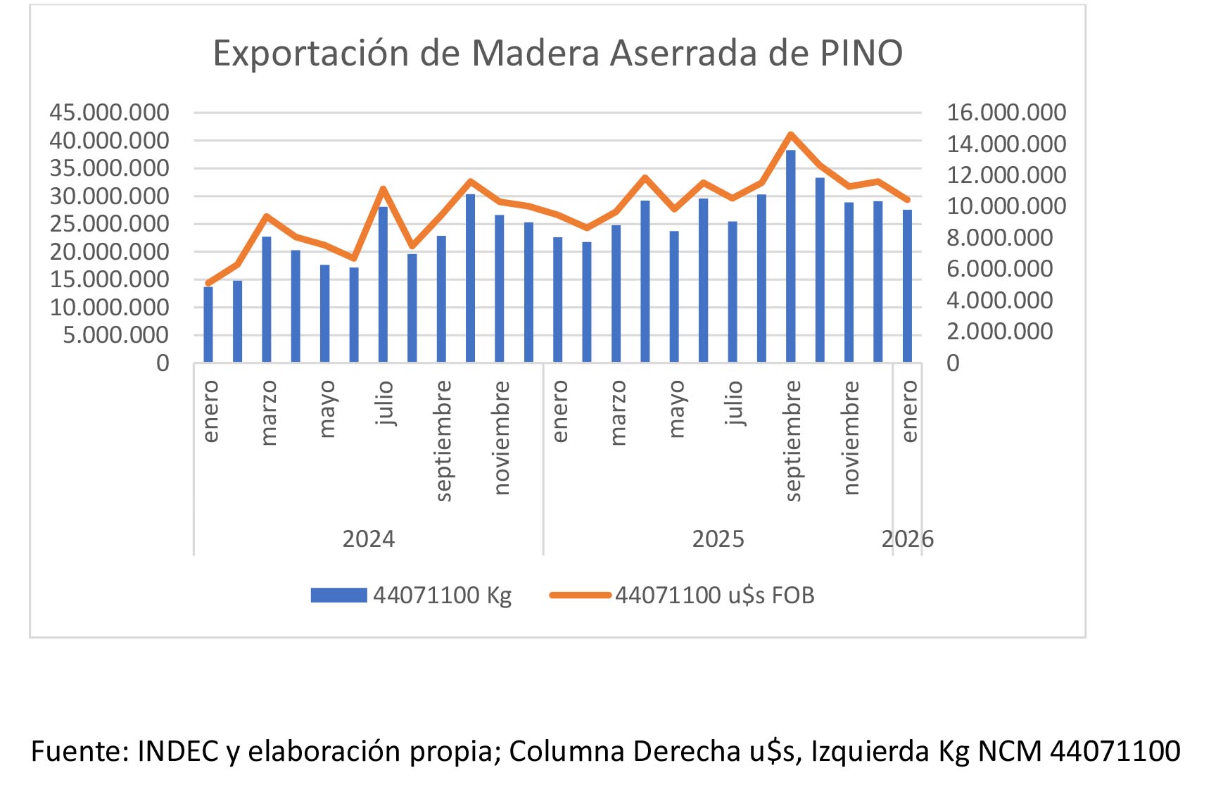 Madera aserrada de pino: analizando los primeros 12 meses del 2025 respecto al 2024 la suba es del 29.37 %, con una disminución estos últimos meses. En diciembre se mantuvo el ritmo de los embarques. El mercado principal sigue siendo Asia y los traders consultados informan que lo precios de madera rústica siguen en valores estables.