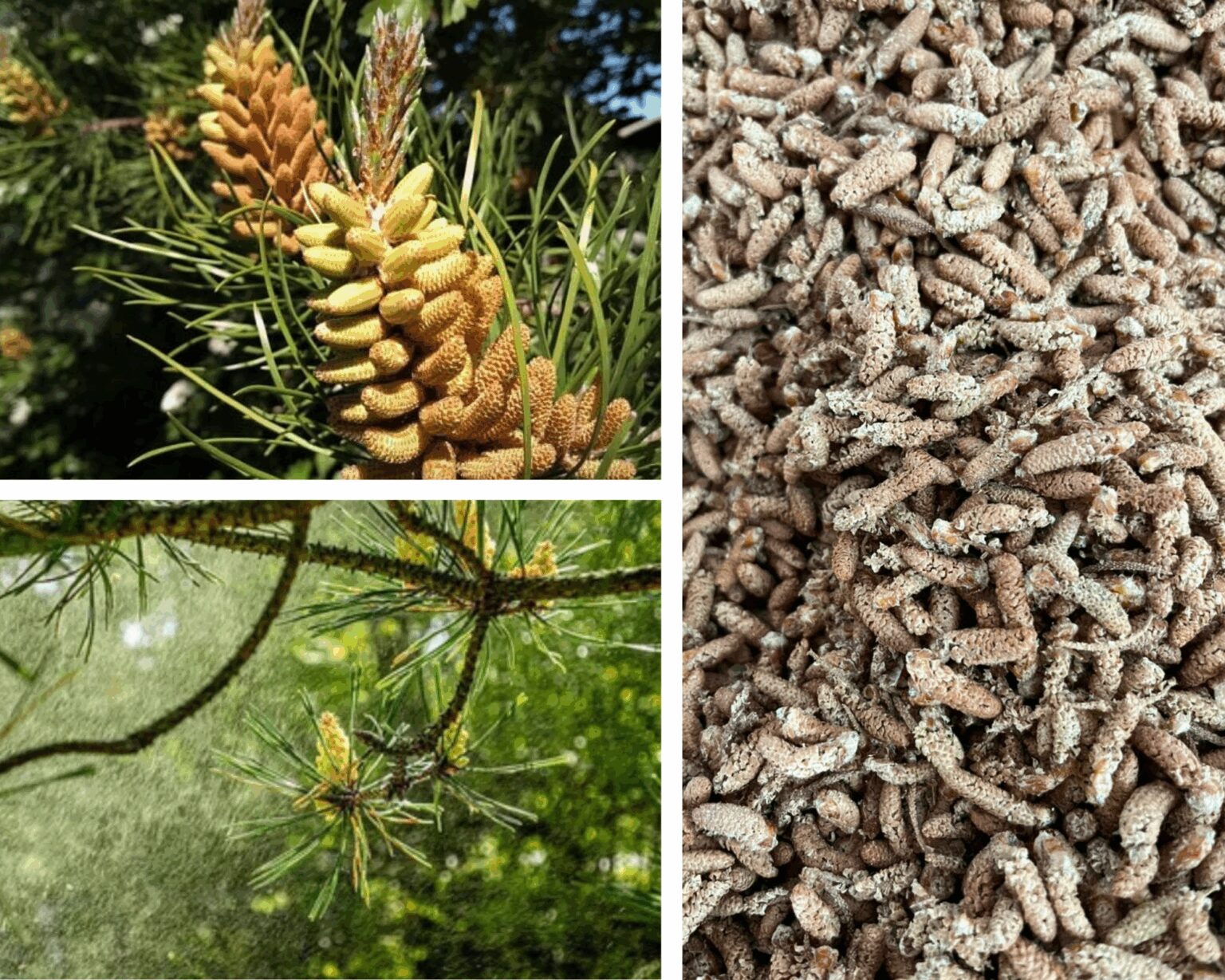 Las semillas no conocen de alambrados: Los pinos provienen del hemisferio norte y se expanden sin control. En la imagen, conos masculinos antes y después de liberar polen. Pueden liberar hasta una tonelada por hectárea